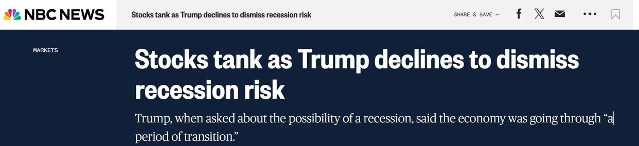 △美国全国广播公司:特朗普拒绝否认经济衰退致使美股大跌