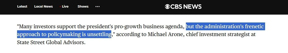 道富环球投资管理公司首席投资策略师迈克尔·阿罗内更是直言,特朗普政府制定经济政策的方式是“疯狂的”,“令人不安”。