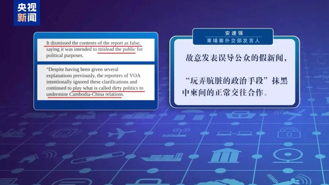 2023年2月,“美国之音”曾发表文章,恶意揣测柬埔寨首相洪森访华目的,柬埔寨外交部发言人安速强怒斥“美国之音”故意发表误导公众的假新闻,“玩弄肮脏的政治手段”抹黑柬中间的正常交往合作。