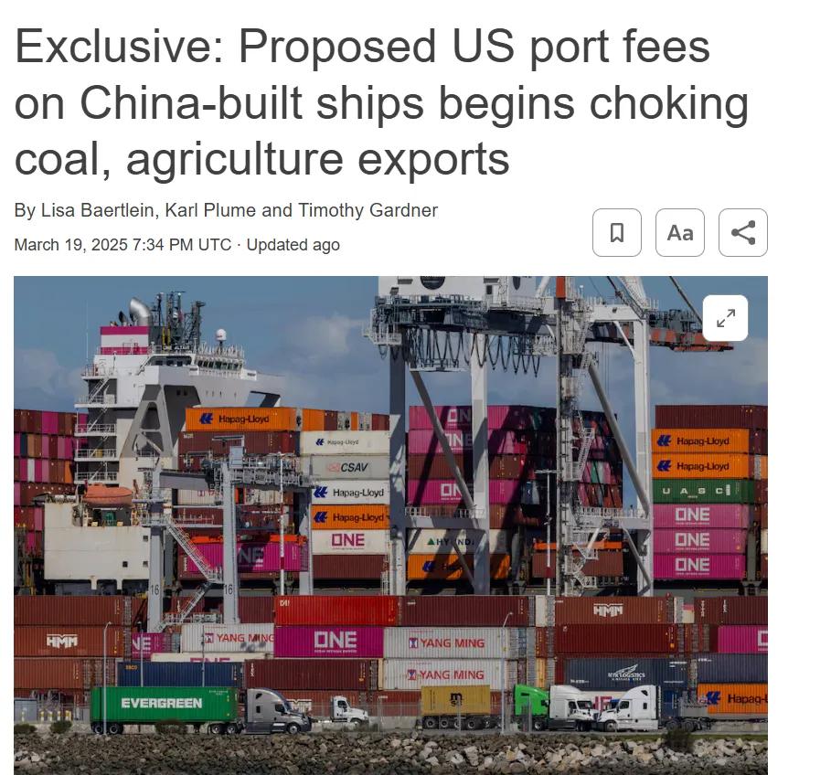 该报道称,美国政府计划通过对停靠美国港口的中国相关船舶征收港口费来重振美国造船业,这导致了美国煤炭库存激增,并加剧了陷入困境的农业市场的不确定性,因为美国出口商难以找到船只将货物运往国外。