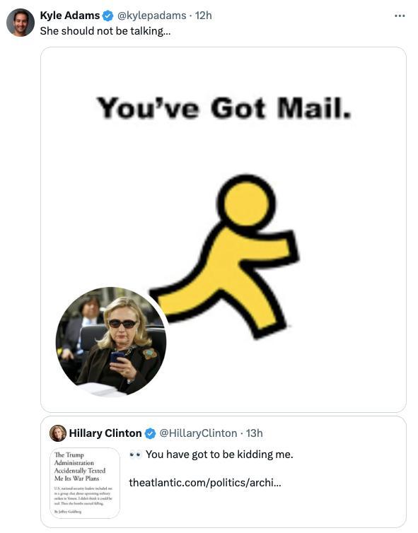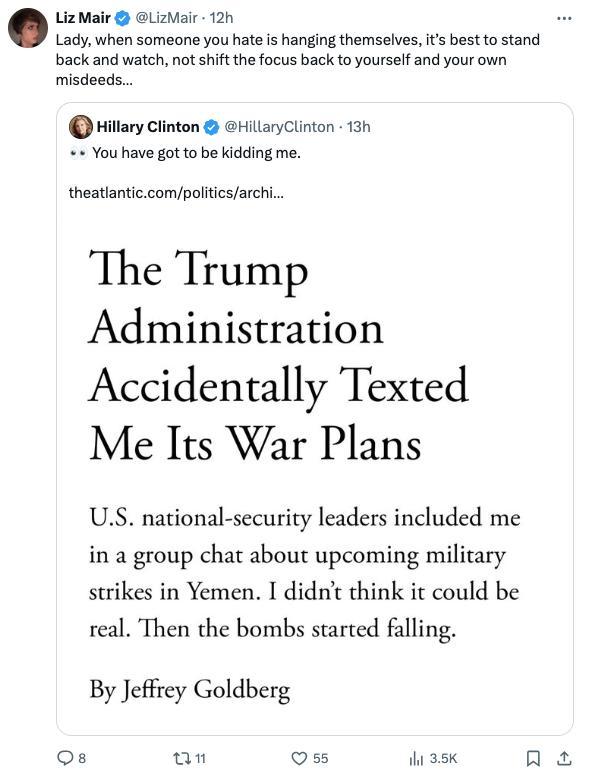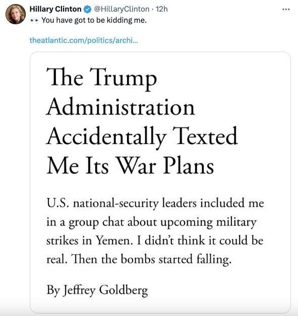 【环球网报道 记者 李飒】“你肯定是在逗我。”美国《大西洋》月刊总编辑爆料自己被意外拉入美国政府高层讨论袭击也门的军事计划群聊一事,持续引发外界关注,美国前国务卿、民主党人希拉里·克林顿在社交平台上发文“补刀”。不过据美国《纽约邮报》报道,希拉里对这一事件的评论很快“翻车”,反被网民嘲讽:她可不该说……