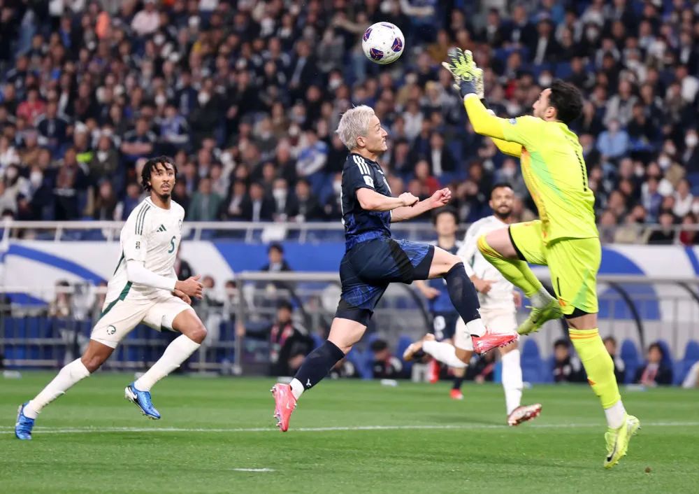 3月25日,日本队球员前田大然(前左)与沙特阿拉伯队守门员在比赛中拼抢。新华社记者 贾浩成 摄