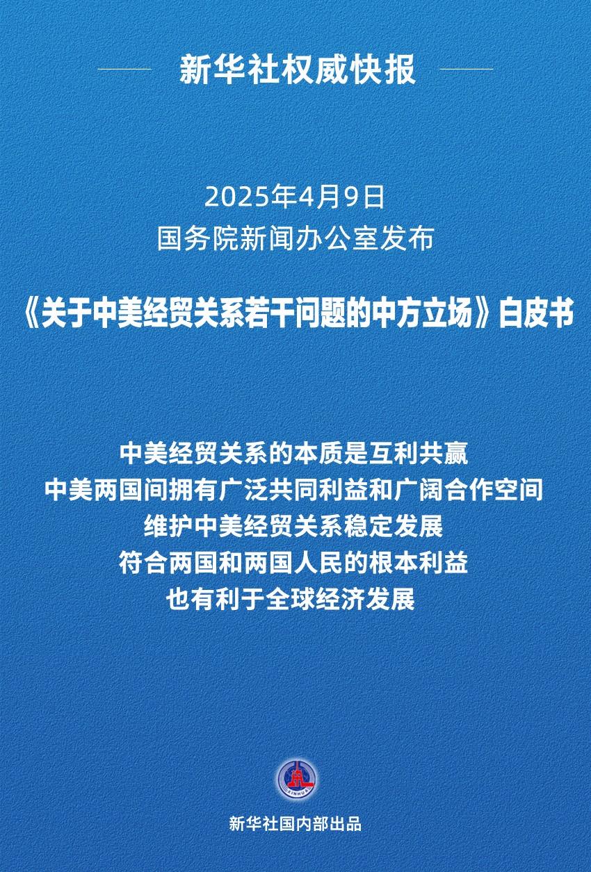 新华社讯 国务院新闻办公室4月9日发布《关于中美经贸关系若干问题的中方立场》白皮书,澄清中美经贸关系事实,阐明中方对相关问题的政策立场。