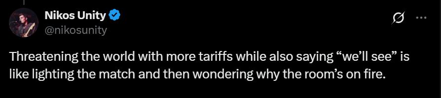特朗普的说法引起网友不满。有网友表示,“用更多关税威胁世界,同时又说‘到时候看’,就像点燃了火柴,然后纳闷为什么房间着火。” ↓