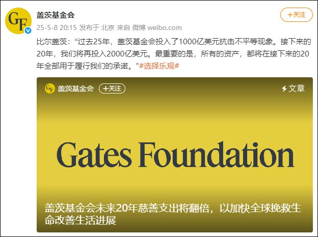 橙柿互动讯 5月8日晚,@盖茨基金会 发文称,比尔·盖茨表示,“未来20年,我将通过盖茨基金会捐出我几乎全部的财富,用来挽救和改善世界各地的生命。”