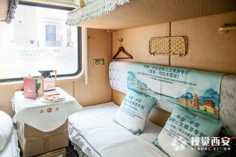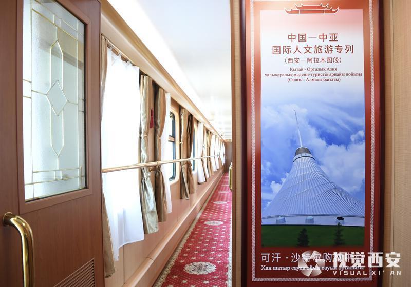 在西安开往阿拉木图的列车途中,车厢内每日安排中医养生活动,非遗手工制作体验,以及知识讲座、书画创作等文化交流活动,沿途开展具有地域特色的秦腔新编历史剧、相声表演、民乐独奏等文化展演,让列车成为“流动的文化交流长廊”。除了丰富的文化活动,专列装饰也做了精心布置,车体内外采用“丝路金桥”主题涂装,车身融入大雁塔、古城墙、钟楼等“西安元素”以及哈萨克斯坦地标性建筑等元素。专列从古丝绸之路起点西安出发,开启新时代的凿空之旅。
