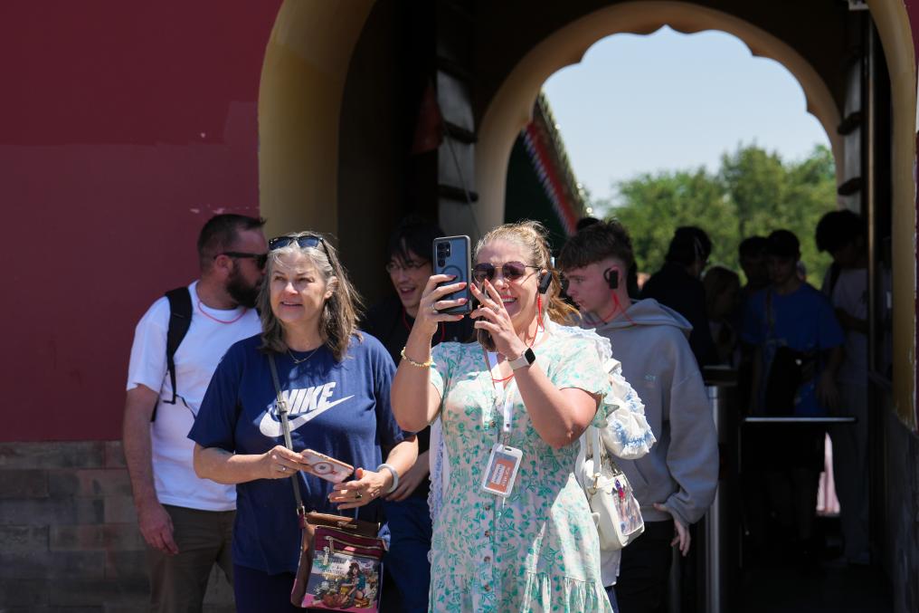2025年5月1日,来自澳大利亚的游客在北京天坛公园游览。新华社记者 鞠焕宗 摄