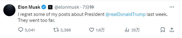 央视新闻讯 美东时间11日凌晨,特斯拉与SpaceX首席执行官埃隆·马斯克在其社交媒体平台“X”上表示,他对上周发表的一些关于美国总统特朗普的帖子感到后悔,称“内容说得太过了”。