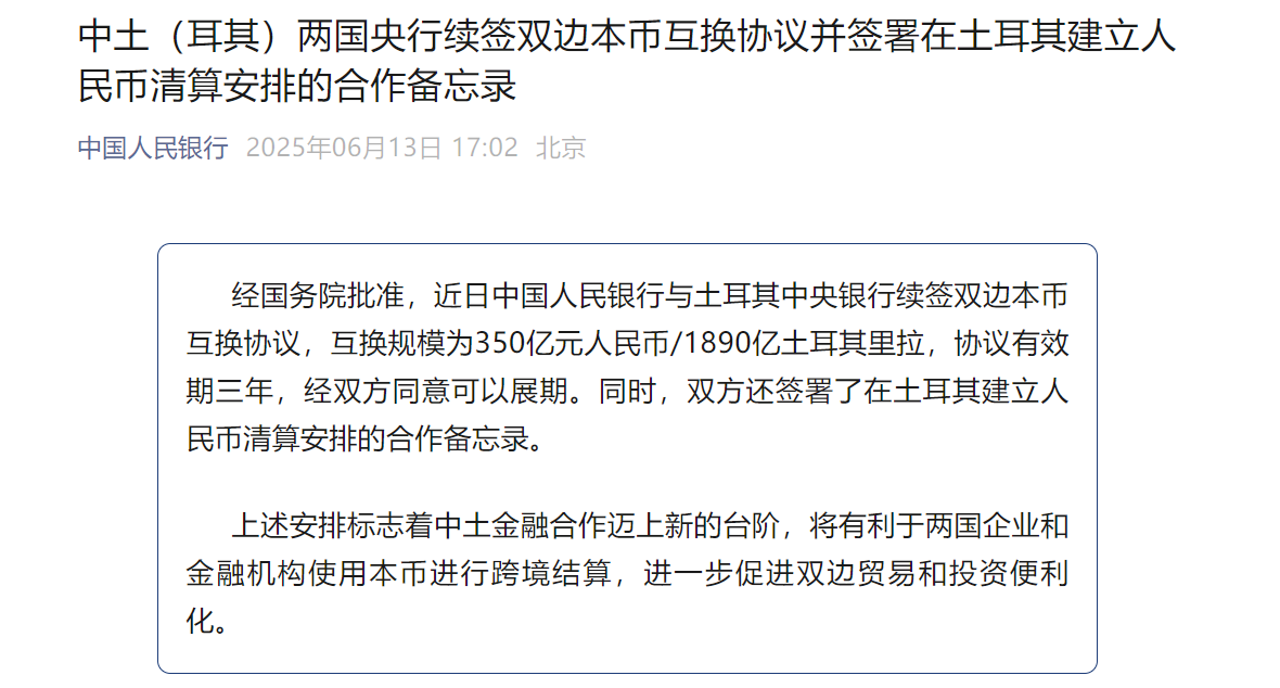 据中国人民银行消息,经国务院批准,近日中国人民银行与土耳其中央银行续签双边本币互换协议,互换规模为350亿元人民币/1890亿土耳其里拉,协议有效期三年,经双方同意可以展期。同时,双方还签署了在土耳其建立人民币清算安排的合作备忘录。