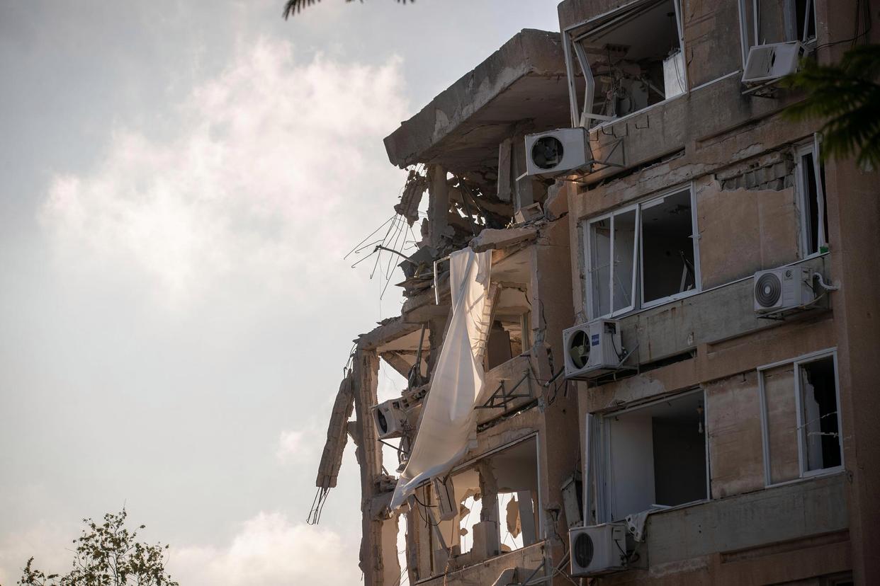 这是6月20日在以色列特拉维夫附近拍摄的一处在导弹袭击中受损的建筑。新华社记者陈君清摄