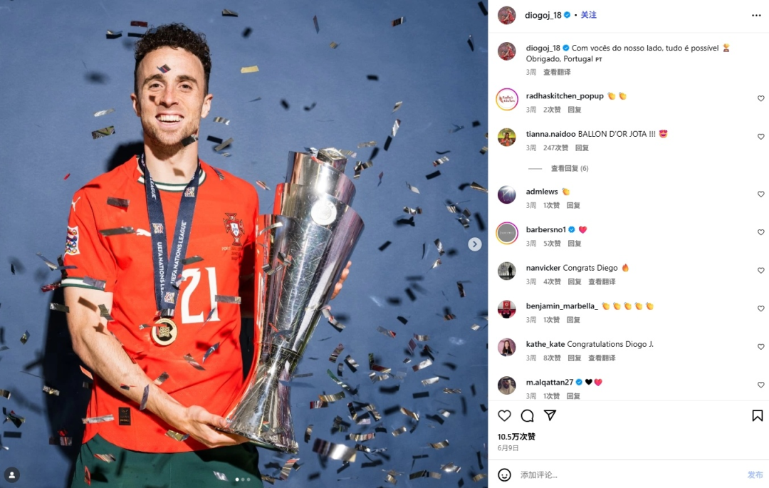 葡萄牙足协在其官方社媒账号上发布讣告,确认若塔因车祸不幸去世。