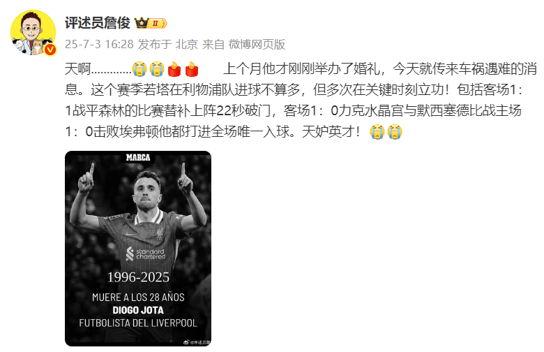 知名体育评论员同时也是利物浦球迷的詹俊在个人社媒发文悼念:上个月他才刚刚举办了婚礼,今天就传来车祸遇难的消息。这个赛季若塔在利物浦队进球不算多,但多次在关键时刻立功!包括客场1:1战平森林的比赛替补上阵22秒破门,客场1:0力克水晶宫与默西塞德比战主场1:0击败埃弗顿他都打进全场唯一入球。天妒英才!