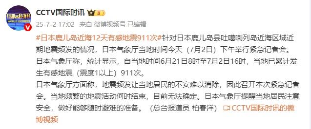 针对日本鹿儿岛县吐噶喇列岛近海区域近期地震频发的情况,日本气象厅当地时间7月2日下午举行紧急记者会。