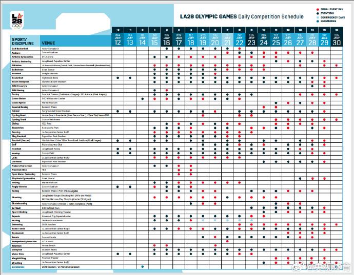 2028洛杉矶奥运会倒计时三周年之际,官方赛程正式公布。同时,洛杉矶奥运会开闭幕式时间确定。