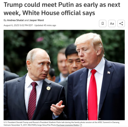 △当地时间8月6日,路透社报道,白宫透露,特朗普与普京最早将于下周举行会晤。