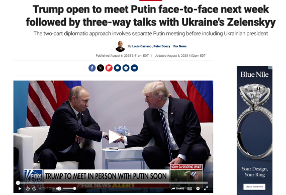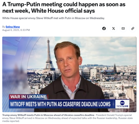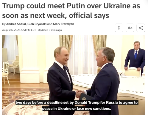 当地时间8月6日,美国中东问题特使威特科夫与普京进行了单独会面,数小时后,白宫即发表了声明。声明称,此次会晤具有“高度建设性”,为总统级对话“扫清了程序性障碍”。随后,包括路透社、《华盛顿邮报》在内的多家美媒引述白宫人士的消息称,特朗普“愿意尽快与普京见面”,时间“可能就在下周”。
