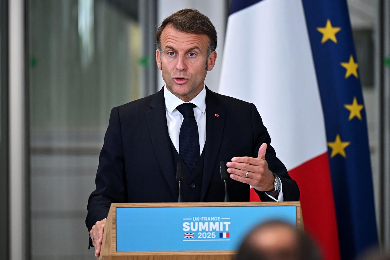 7月10日,法国总统马克龙在英国伦敦郊外诺斯伍德军事基地出席与英国首相斯塔默(不在画面中)举行的联合记者会。新华社/法新