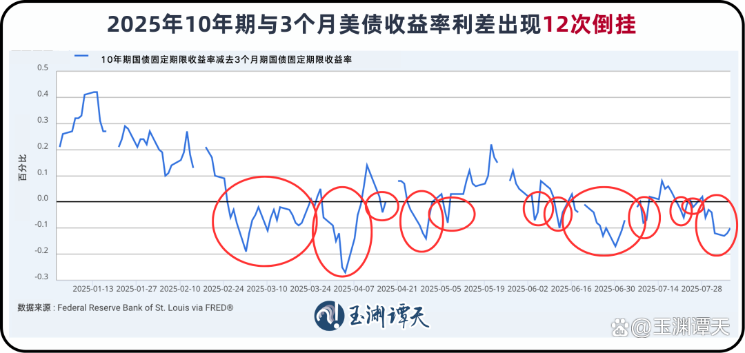 但今年的情况有些不同,按10年期与3个月国债利差,收益率曲线频繁倒挂。到现在,已经出现12次倒挂。