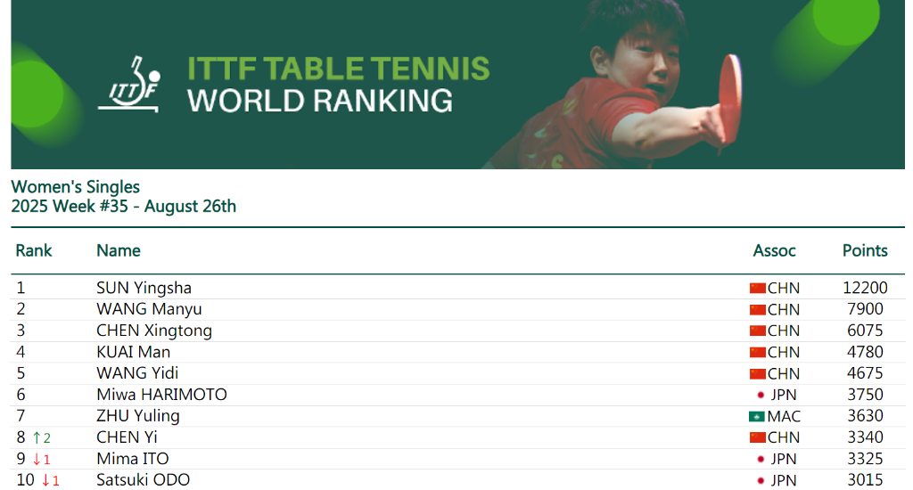孙颖莎与队友王曼昱、陈幸同、蒯曼、王艺迪位列女单世界前五。日本选手张本美和、中国澳门队朱雨玲分列第六和第七。凭借在欧洲大满贯赛瑞典站闯入四强的表现,另一位国乒队员陈熠排名上升两位,位列第八,刷新个人职业生涯排名新高。日本选手伊藤美诚和大藤沙月分列第九和第十。