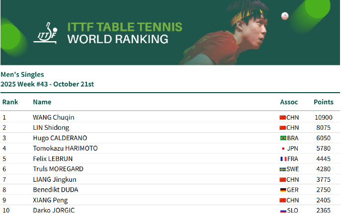 男单方面,王楚钦10900分排名第一,林诗栋8075分排名第二,雨果6050分排名第三。