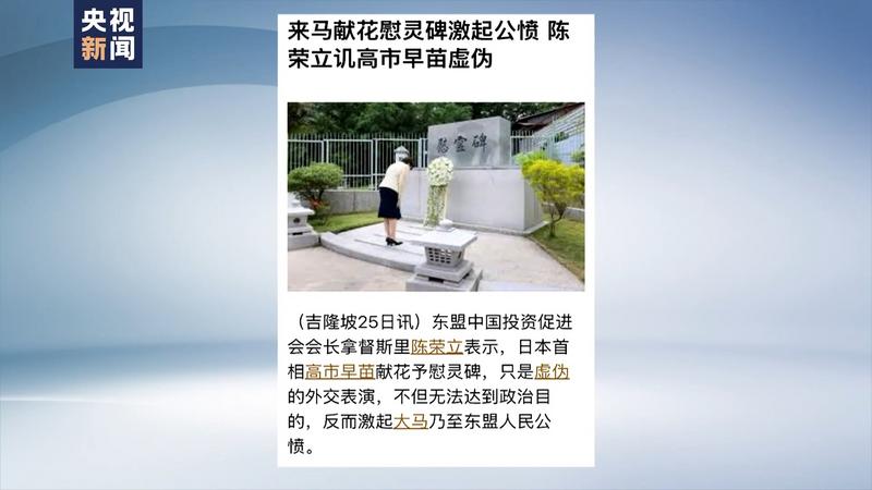 东盟中国投资促进会会长陈荣立在马来西亚《星洲网》撰文表示,日本首相高市早苗在吉隆坡向战死日军的“慰灵碑”献花,此举激起马来西亚乃至整个东南亚地区人民公愤。陈荣立说,高市只字不提日军罪行,却企图模糊概念,将侵略者与反抗侵略者混为一谈,乃至淡化或美化日军侵略史,其龌龊之行径,等同亵渎历史,并二次伤害马来西亚人。他认为,高市应为日军的侵略史公开道歉,而非通过政治伎俩,扭曲事实。从所谓“台湾有事”的言论,到“致敬侵略者”,高市一再挑战周边国家底线。