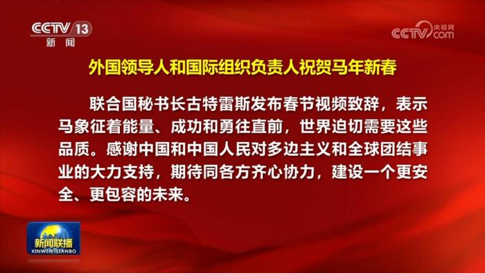联合国秘书长古特雷斯发布春节视频致辞,表示马象征着能量、成功和勇往直前,世界迫切需要这些品质。感谢中国和中国人民对多边主义和全球团结事业的大力支持,期待同各方齐心协力,建设一个更安全、更包容的未来。