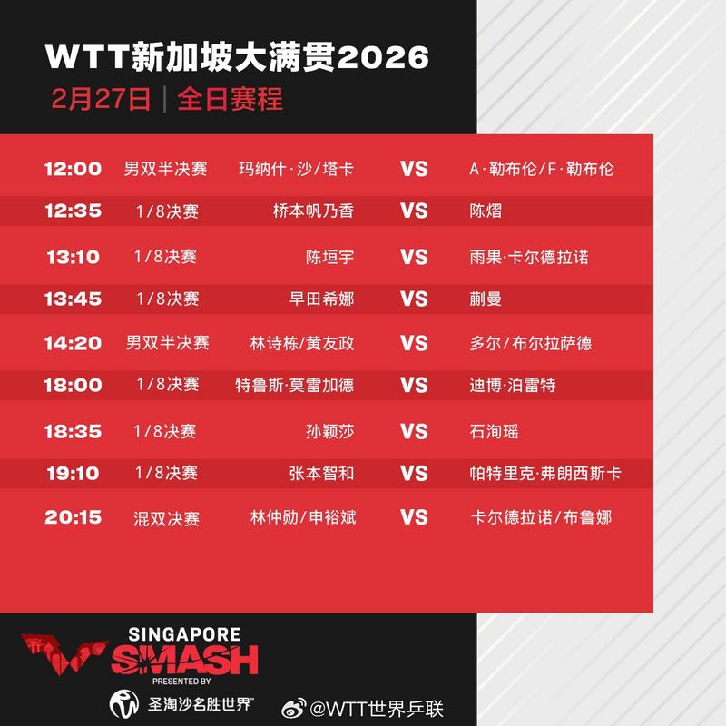 27日,2026年WTT新加坡大满贯进入第6个正赛日,将进行男女单打1/8决赛、男双半决赛和混双决赛。多位国乒队员出战,一起为中国队加油!具体赛程如下:
