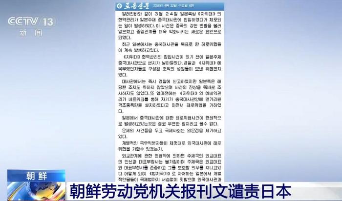 央视网讯 针对近期日本接连发生以中国驻日本大使馆为目标的恐怖威胁,朝鲜劳动党机关报《劳动新闻》今天(22日)刊发评论文章,对日本进行谴责。