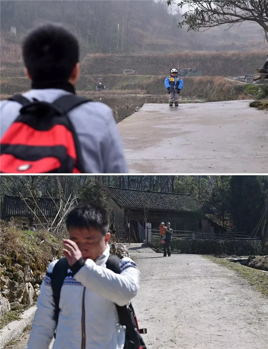 2017年1月19日,在广东打工的石欣回到家乡湖南省花垣县溜豆村,突然发现3岁的儿子站在树下等着自己回家(上图);2017年2月12日,在60多岁的父亲和3岁的儿子的目送下,石欣抹着眼泪快步向村外走去离家打工(下图)。新华社记者梁旭摄