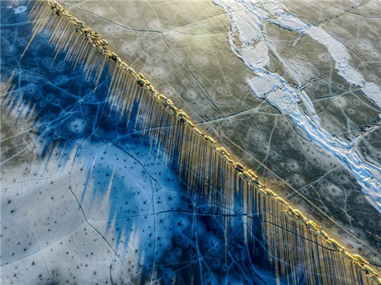 2017年2月9日,太阳露出地平线,转场的羊群在西藏普莫雍错冰面投下纤长的蓝色影子。新华社记者普布扎西摄