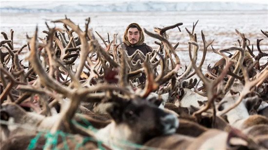 2017年11月4日,在俄罗斯亚马尔-涅涅茨自治区,一名涅涅茨男子将驯鹿圈进围栏。新华社记者白雪骐摄