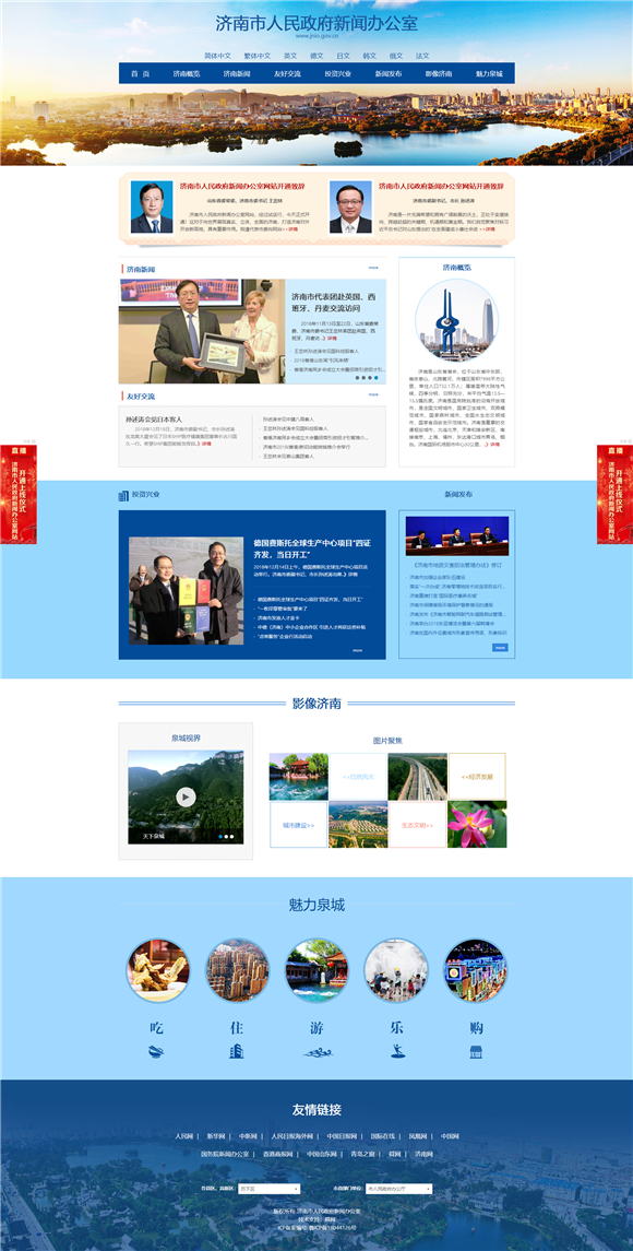 济南市委外宣办、市政府新闻办主任 赵民 济南日报报业集团副总编辑、舜网董事长马凯 网站先期开设了济南概览、济南新闻、友好交流、投资兴业、新闻发布、影像济南、魅力泉城等七大版块,既有对济南基本概况、历史人文的综合介绍,又有对市委市政府决策部署、中心工作、重大活动的新闻报道;既有招商引资政策举措,又有济南与海内外友好交流活动;既有政府权威新闻发布,又有泉城名胜美食等,全方位、多角度宣传展示济南市在经济发展、城市建设、民生改善、社会事业、文化旅游等各个领域取得的新成就。 中共济南市委常委、宣传部部长杨峰在开通上线仪式上指出,济南市人民政府新闻办公室网站是展示泉城形象的新阵地,是宣传泉城文化的新渠道,是世界了解济南的新窗口,是济南了解世界的新平台。网站运营开通后,要以强烈的责任感使命感,主动与世界接轨,着眼于海外宣传,讲好济南故事,传播好济南声音,宣传好济南形象,打造对外宣传新高地,提升济南在海内外的知名度和影响力。 济南市人民政府新闻办公室网站同时开通中文、繁体中文、英文、德文、日文、韩文、俄文、法文等八个语言文字频道,是目前我国地方党委政府外宣(新闻办)网站中,语种最多最全的地方网站。针对不同国家和地区受众人群阅读习惯和心理,借鉴当地网站页面风格和版式,用不同国家受众人群喜闻乐见的语言和方式,最大限度提高外宣质量和效果。网站在设计风格上充分借鉴国际传播流行文化,综合运用文字、视频、图片、flash动画、H5等全媒体手段,实现图文滚动、视频点播、图片搜索、网友互动等功能,带来良好的视觉享受。