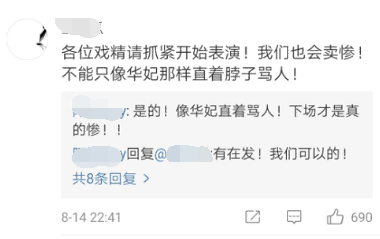 不仅如此,这些粉丝们还在中国境内的微博等平台互相分享和交流着怎么在境外的社交平台上与这些极端分子和网络暴徒辩论的经验,该采用什么战术等等。 比如下面这两位“粉丝”就表示,大家不能只和这些极端分子硬刚,不能只去骂他们,还要争取更多人的支持,要学极端分子那样去“卖惨”。其中一位粉丝还表示,大家要活学活用《甄嬛传》、《延禧攻略》的斗争技巧:
