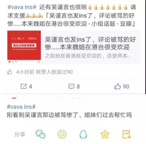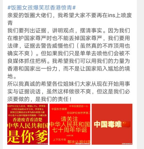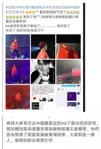 另外,一些新成为香港极端分子围攻对象的爱国爱港艺人的粉丝,也在微博等境内社交平台上呼吁大家去支持和帮助自己的“爱豆”: