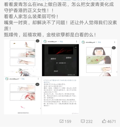 有人还分享了一些比较有内涵的文字,供这些反击香港极端分子的明星“粉丝”们参考: