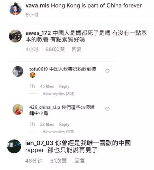 如上图所示,在周二香港机场的那些极端示威者和想彻底搞乱香港的暴徒们袭击了一名内地游客和一名《环球时报》的记者后,包括中国嘻哈歌手VaVaMiss、艾福杰尼、Melo谢宇杰,以及艺人张艺兴等人,都在他们开设在境外社交平台Instagram的账号上,同步了他们支持香港警察,谴责暴徒袭击记者和无辜游客暴行的内容。 但他们的正义言论却很快遭到了极端抗议者、乱港暴徒以及他们的支持者的围攻。比如VaVaMiss因为表示“香港永远是中国的一部分”,就遭到暴徒们恶毒的侮辱;艾福杰尼则遭到这些极端分子威胁要“取关”他。