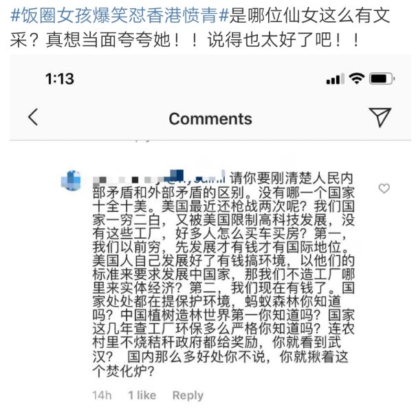 但这些猖狂的网络暴民却忘了一件事,这些爱国爱港的艺人,可是拥有大量“粉丝”的。而这些“粉丝”也根本无法接受他们的“爱豆”仅仅因为爱国爱港,支持港警打击暴力行为,就被人骂成这样。 于是,在过去这几天,这些不同艺人的粉丝们,都纷纷放下了原本饭圈内部的“吵嘴”与“互撕”,纷纷来到这些境外的社交平台上:一边给“爱豆”鼓劲打气,一边则与他们的“爱豆”一起反击起香港那些极端分子和暴徒来。