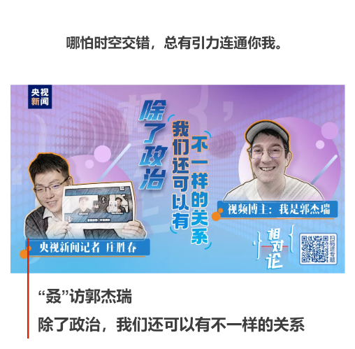 央视新闻《相对论》:既然已经决定了,大家还会关注总统候选人的辩论吗?你会关注吗? 郭杰瑞:会看的。我们看辩论是一个传统,有点像大家看篮球赛,都会支持我们要支持的人。至于辩论结果,如果你问支持特朗普的人,他们肯定会说特朗普赢了;如果你问支持拜登的人,他们肯定说拜登赢了。 央视新闻《相对论》:除了这种支持的心情,还会从辩论中看什么吗? 郭杰瑞:很多美国人觉得这次辩论不是总统候选人的辩论,是小朋友间的辩论。之前无论有多少不同的意见,还是相对和平的。这次特朗普骂拜登不聪明,拜登骂特朗普是小丑,还让他闭嘴。我不喜欢看这个,很多人应该都不喜欢。他们中的一个以后会是我们的总统,我们希望他们有总统的样子。 央视新闻《相对论》:你还有一期视频是调查美国人对于生活满意度的,很多人打的是2分、3分,也有一个是打满分。视频中你和一些美国人也表达了这样的观点:事情越来越极端。如果你不是这边的,你就是那边的。如果你是中间的,两边都认为你是坏人。 郭杰瑞:这几年在共和党和民主党中间的温和派越来越少。在Facebook和Twitter上,极端的话题越来越多,没有人管,还有假新闻。 央视新闻《相对论》:你觉得是假信息的泛滥造成了现在这种极端? 郭杰瑞:像福克斯新闻,他们如果讲些中立的话,观众就会觉得无聊。他们如果说奥巴马是坏人,拜登是坏人,肯定能吸引更多观众。美国也有公共媒体,他们是比较中立的,但是没有人看这个。 央视新闻《相对论》:其实,“分裂”不光出现在美国,“团结”也不应该只是美国人团结,国与国之间也要团结。 郭杰瑞:这个是全世界的问题,只有一个方法解决就是比较好的教育,可能就不会有很极端的想法。 央视新闻《相对论》:但这是一个长期的过程,看来我们得跟“极端”共存很久。 郭杰瑞:是的,没有很容易的方法解决这个问题。 “面子” 8月,央视新闻《相对论》对话马云时,谈到郭杰瑞认为“中国年轻人对美国的了解,比美国年轻人对中国的了解多”。当时马云回应:“过去四十年,中国人愿意了解世界的能力,使我们的国家变得不同,当我们懂得找差距,我们就在进步。” 这一次,话题继续。 央视新闻《相对论》:你一开始拍视频,是因为有中国人对美国有误解。后来又想把中国真实的情况再拍给美国人看。一两年过去了,你觉得美国人对于中国的误解是更深了,还是有所缓解? 郭杰瑞:我看到你采访马云的时候,给他看了我的视频,我真的特别开心。他说中国人有很强的学习能力。但很多人觉得美国是最好的国家,不需要学习其他国家,这其实就是我们的问题。去国外旅行的美国人可能会意识到这个问题,但大部分美国人一直在美国,就意识不到。在美国,新闻一般都是报道其他国家负面的事情,而不是给美国人看其他国家比我们好的东西,比如科技等等。 央视新闻《相对论》:马云在采访中还说,“当我们走出国门时,懂得找差距就是在进步,找感觉,其实是在退步。”你觉得中国现在相比美国或者世界其他地方,最大的差距在哪里? 郭杰瑞:我在美国有很多中国留学生朋友,他们觉得自己英语不好,交不到美国朋友。其实是有点太在乎面子了,失去了很多机会。我觉得大家要有更多自信。我就是一个中文不好的美国人,但是我一直讲一直讲,现在可以接受CCTV的采访。 央视新闻《相对论》:对,一个坚持用中文接受采访的美国人。 郭杰瑞:对。很多老外去中国,他们没有学过中文,但还是会去跟大家用中文交流。 “除了政治” 郭杰瑞一直期待着回到中国,会老友、拍美食、继续咖啡的生意。他相信,在政治之外,“我们都是一样的,都要吃好吃的,都要过好的生活。” 但他也有发愁的事儿,“真的很担心”。 央视新闻《相对论》:大选过程中,双方都会说中国的问题,这会加深美国人对于中国的误解。 郭杰瑞:但是我要我的中国朋友知道,除了政治的关系,我们在好多其他的地方还可以有不一样的关系。比如美国人和中国人的关系,美国科学和中国科学之间的关系...... 央视新闻《相对论》:两国关系受到影响,其实影响的是每个人的生活。比如一些签证问题,会影响到留学生、访问学者,人文交流就会变少。你的生意在中国,你的视频也是中国人在看,你会很发愁吗? 郭杰瑞:我真的很担心这个。本来我们要在美国卖我们的咖啡,还有很多美国的农场生意不好,都停滞了。我真的希望大选后、疫情后我们可以重新开始好的关系。 央视新闻《相对论》:上次我们聊到乒乓外交,弹幕满屏的网友建议,有“麻辣烫外交”“电竞外交”等等。 郭杰瑞:对,我觉得最重要的就是让很多美国人去中国,看到相同的地方,而不是不同的地方。 央视新闻《相对论》:如果再约下一次聊天的话,你希望是什么时候?什么方式? 郭杰瑞:在大选之后,希望我们有不一样的关系。我真的希望,美国和中国的关系有很多地方可以进步。希望下一次可以来北京,我们可以人对人采访。 央视新闻《相对论》:人对人?是面对面。上次我们击掌,因为网络延时没对上,再来一次。