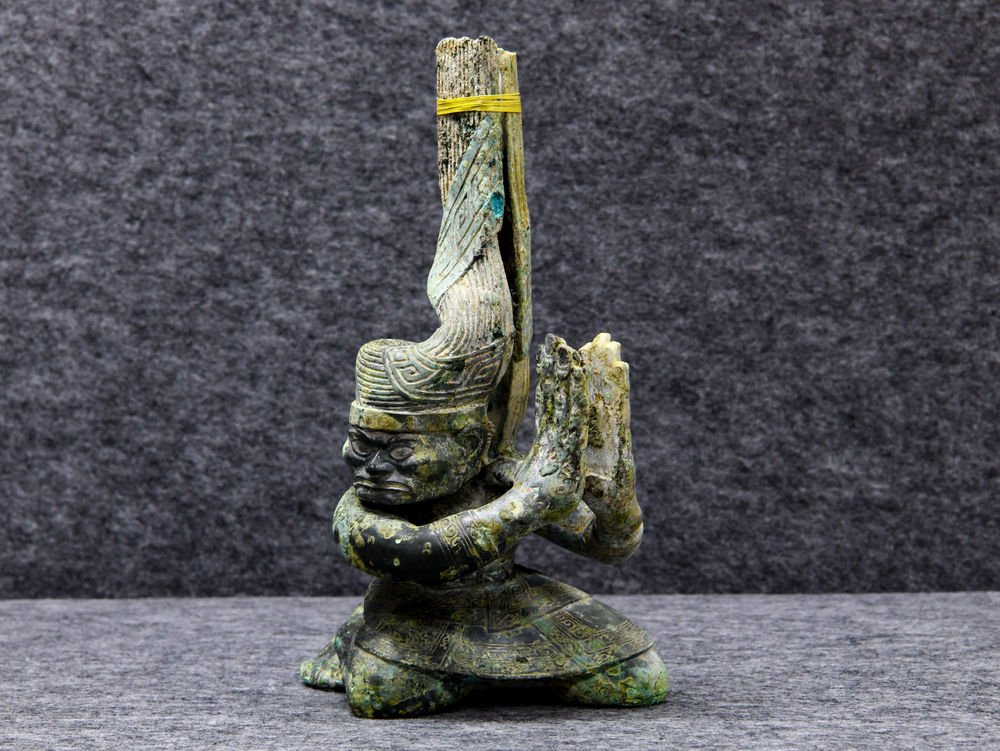 ↑这是9月3日在四川省文物考古研究院三星堆考古研究所拍摄的三星堆遗址4号“祭祀坑”出土的铜扭头跪坐人像。新华社记者 王曦 摄
