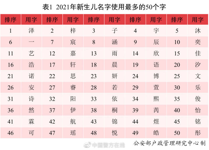2021年出生并已经进行户籍登记的新生儿名字中,使用频率最高的50个字依次为泽、梓、子、宇、沐等。与2020年相比,汐、芮、霖、航等字受到青睐。(详见表1)