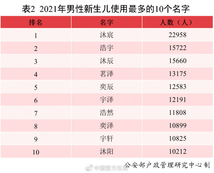 2021年出生并已经进行户籍登记的男性新生儿中,使用频率最高的10个名字依次为:沐宸、浩宇、沐辰、茗泽、奕辰、宇泽、浩然、奕泽、宇轩、沐阳。与2020年相比,除浩宇、奕辰、宇轩外,其余名字首次进入前十,其中“沐宸”使用人数达到2.3万,登顶榜首,成为男性新生儿名字首选。(详见表2)