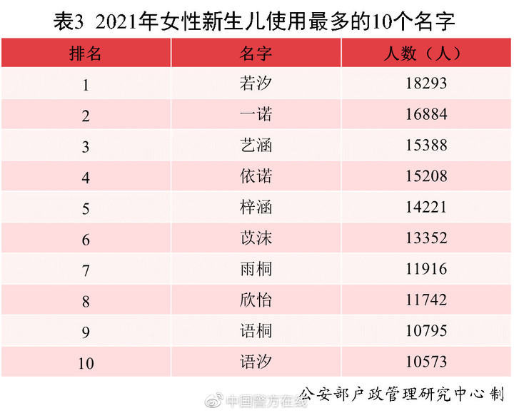 2021年出生并已经进行户籍登记的女性新生儿中,使用频率最高的10个名字依次为:若汐、一诺、艺涵、依诺、梓涵、苡沫、雨桐、欣怡、语桐、语汐。与2020年相比,若汐、艺涵、苡沫首次进入前十,其中“若汐”使用人数达到1.8万,登顶榜首,成为女性新生儿名字首选。(详见表3)
