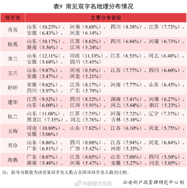 全国使用最多的10个双字名相对集中分布在山东、河南、四川、江苏、河北、湖南、安徽等省份。此外,还有5.24%的“桂英”分布在江西;5.79%的“婷婷”、6.81%的“秀珍”、8.07%的“海燕”分布在广东;5.91%、5.23%的“建华”分布在江西和浙江;7.37%、7.35%、5.18%的“桂兰”分布在辽宁、黑龙江和吉林;5.42%的“秀珍”分布在广西。(详见表9)