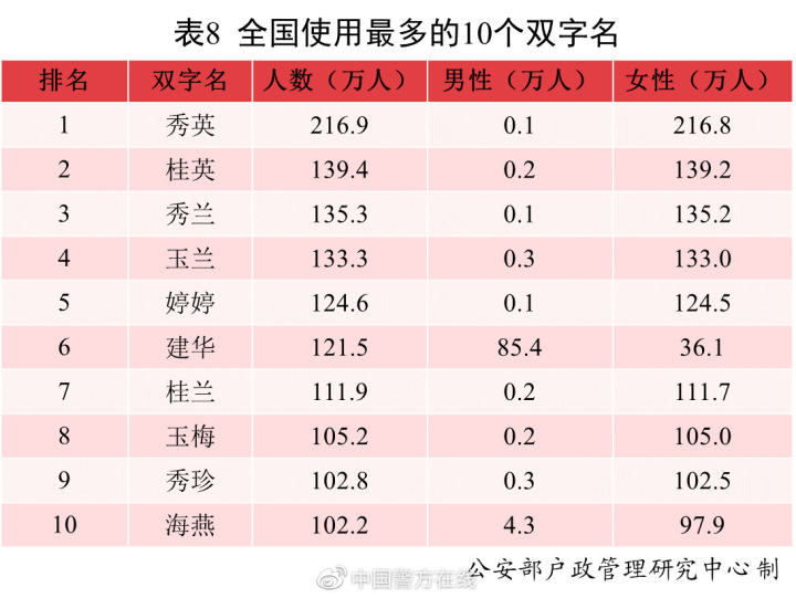 全国户籍人口中,使用频率最高的10个双字名依次为:秀英、桂英、秀兰、玉兰、婷婷、建华、桂兰、玉梅、秀珍、海燕。其中“秀英”名列榜首,使用人数为216.9万。男性使用较多的双字名仅有“建华”;其余常见双字名为女性使用较多,重名率明显高于男性。(详见表8)