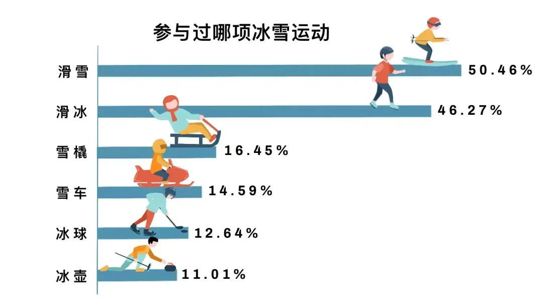 而在各类冰雪运动中,选择滑雪运动的人是最多的,有一半以上的人玩过滑雪。