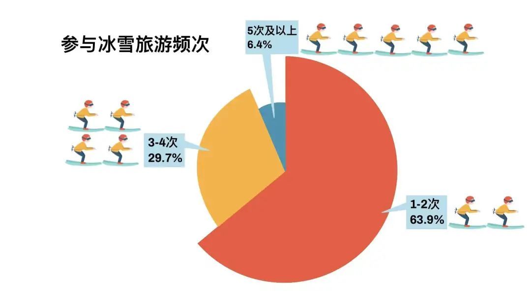 在参加过冰雪旅游的消费者中,有六成以上的人参加过1-2次冰雪旅游,有三成消费者参加过3-4次冰雪旅游。参加过5次及以上冰雪旅游的消费者占比为6.4%。