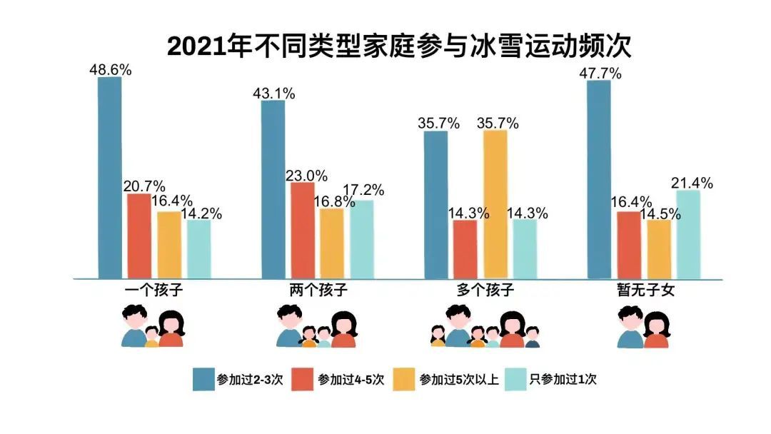 2021年,有三成以上的多娃家庭,参加过5次以上的冰雪活动,这个比例远远超过一孩和二孩家庭。看来,冰雪天地也是遛娃的福地。