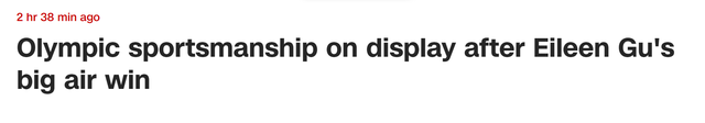 美国有线电视新闻网(CNN)发表题为《谷爱凌在大跳台获胜后展现奥运精神》的文章,称勒德在最后一跳完成后很失望,因为她知道自己无法拿到金牌。这时中国运动员谷爱凌和瑞士运动员玛蒂尔德·格雷莫走过去安慰她,这一幕是“奥林匹克精神的展现”。