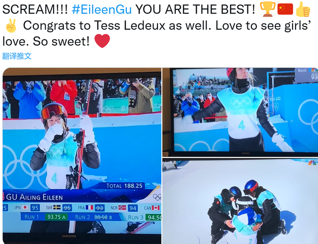 许多外国普通网友也在社交平台上纷纷送上点赞,“谷爱凌你真棒!也祝福勒德。”“女孩子们这一幕真有爱!”“你们的体育精神是一流的!”