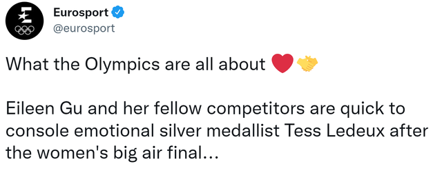 美国体育新闻网站《运动员》副主编卢卡斯·威斯也对谷爱凌的表现大为称赞,他说,“我们乐见运动员之间的这种关怀和友爱。”欧洲体育频道(Eurosport)在一条置顶的推文中,发布了谷爱凌安慰勒德的现场视频,并配上文字,“这就是奥运会的全部意义。”